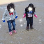 週末に積もった雪がとけて水溜りになっていたり、所々には残り雪もありました。子どもたちはそれもまた楽しく、残り雪を踏んだり水溜りに入ってみたり、また乾いたところでは凧あげをして楽しんでいました。